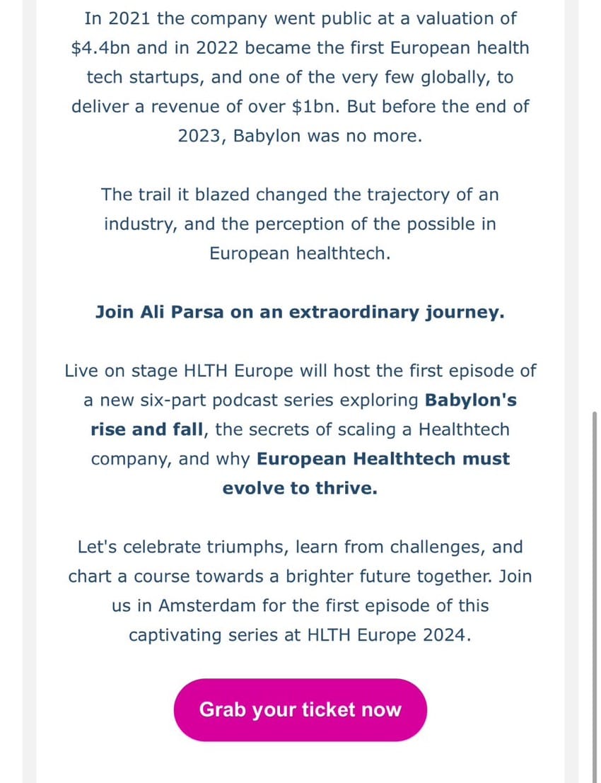 Ex-Circle and ex-Babylon Aloytius Parsadoust is doing a podcast, presumably about how to lose all your original investors’ money on a new, heavily hyped health business twice in a row.