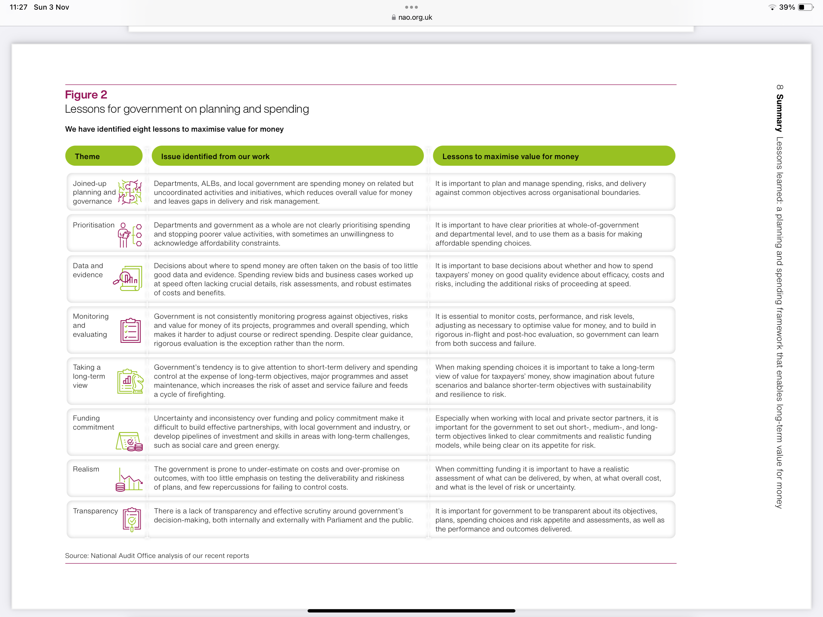 This is a big problem. Likewise, the NAO document’s near-total absence of references to the importance of organisational culture. Its concluding remarks do at least note that “changing the incentives and behaviours embedded across central government will take leadership, functional expertise and collegiate behaviour at all levels, official and political, over a whole Parliament and beyond”, and that is fine on paper. But it isn’t a ‘how’: it isn’t anything actionable.