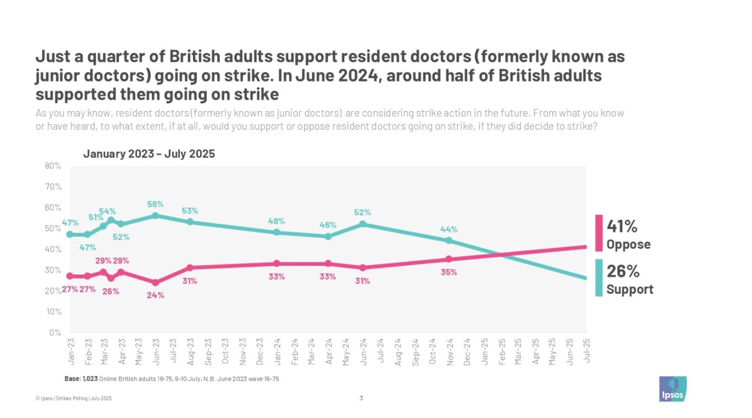 And new Ipsos polling, given to The Guardian as an exclusive, confirms the trend: it finds that “just one in four (26%) British adults support resident doctors going on strike, in polling taken since their latest round of industrial action was announced (9-10 July).