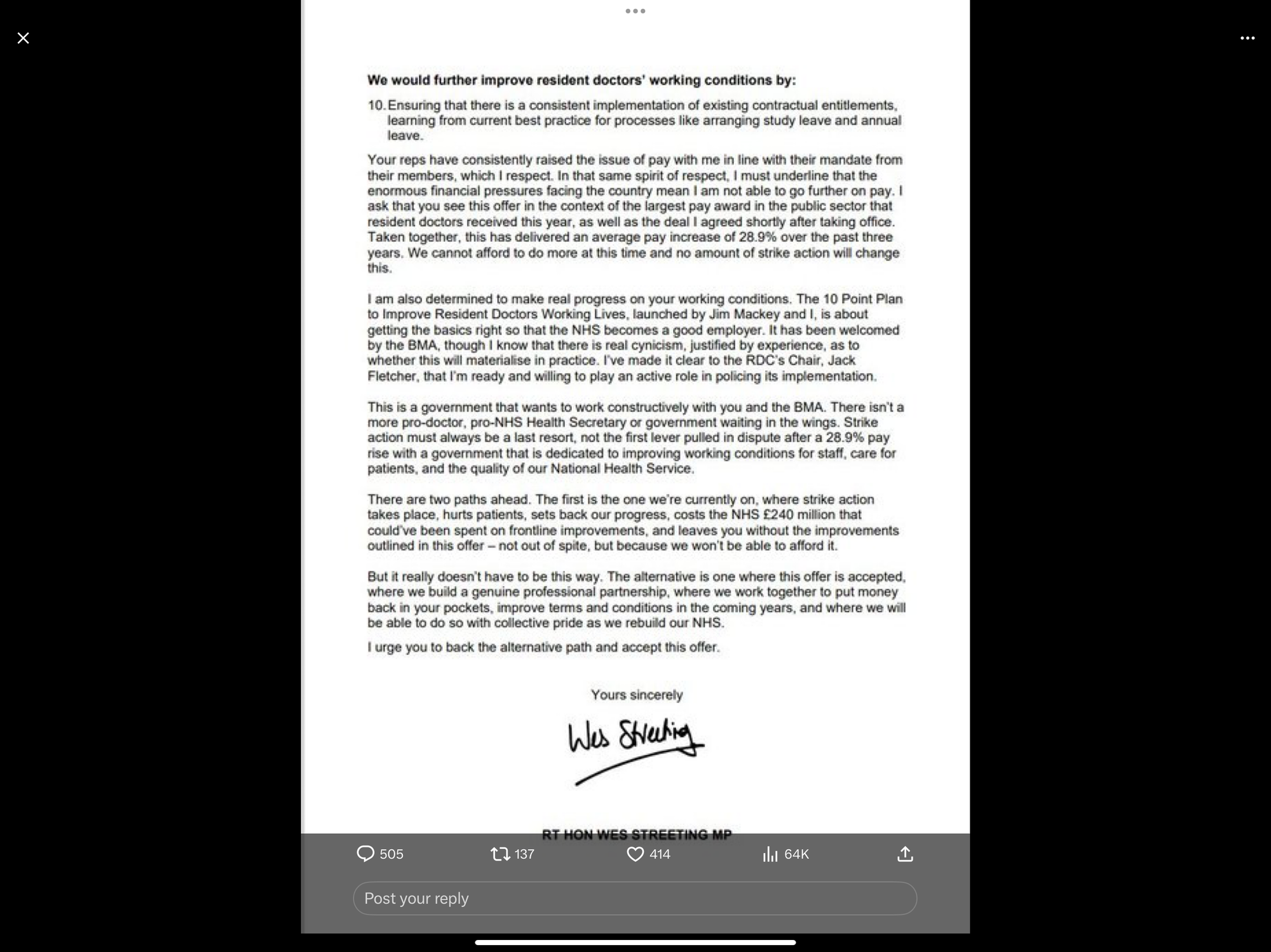 And as I noted last week, probably the smartest move that Team Milburn-Streeting made since coming into office (if not into power) was to heavily publicise the significant pay rise that they immediately gave to end that industrial action.