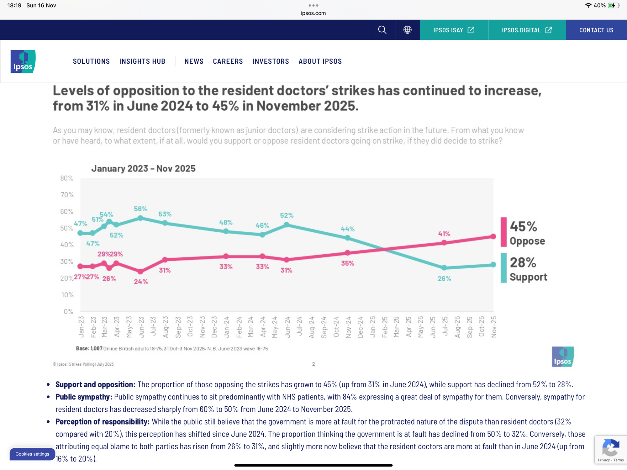 As I also noted in last week’s column, public support continued throughout the (then)-junior doctors’ salary strikes against the last Conservative Government in 2023-24. The strikes became less popular as they went on and on, but they never dropped below a majority of public support.