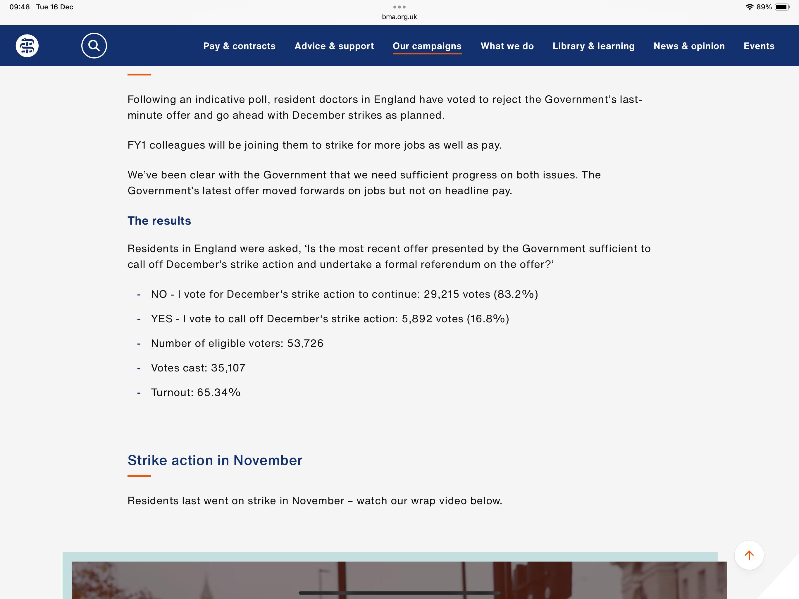 Although turnout in the online vote was only 65%, their leaders’ mandate to continue with this week’s strike action was an impressive 83%. It is evident that those BMA member resident doctors who bother voting are not yet tired of striking; nor inconvenienced by the loss of pay (which might be said to make the Government’s point).