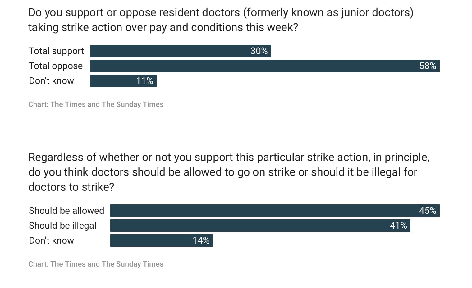 New polling by YouGov shared with The Times showed that 58% of those surveyed opposed the strike. It also found that while 34 per cent of survey respondents thought that junior doctors were not paid enough, 36 per cent said they were paid the right amount.