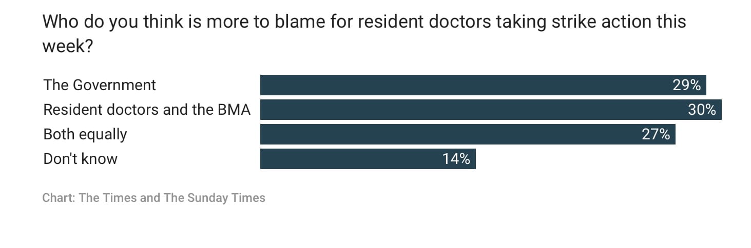 By a tiny margin, the respondents suggested that resident doctors and the BMA (30%) were more responsible for the strike action than the Government (29%), although neither category was that far ahead of ‘both equally’ (27%).