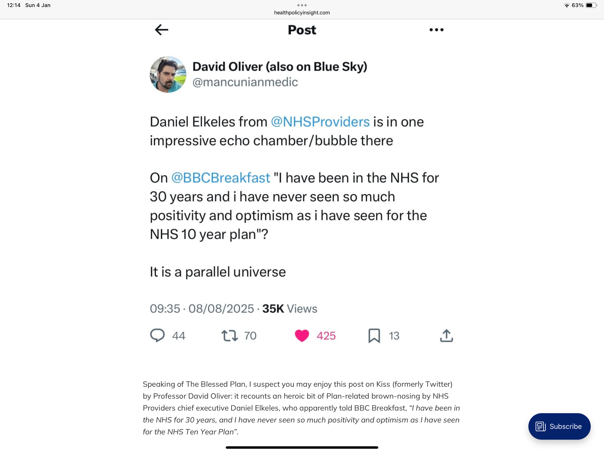 As to Brown Nose Dan, in true Milburnian style he opens a piece that is inevitably about “the challenges and concerns that NHS leaders will have to tackle in 2026” while in true Wilkins Micawber / Pollyanna style, hinting at “the opportunities there for the taking”.